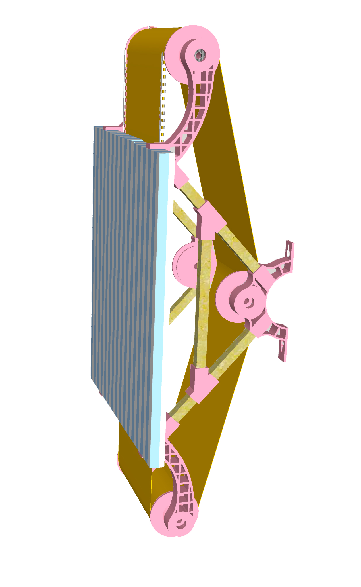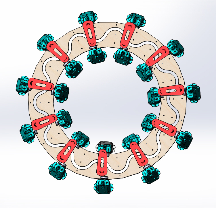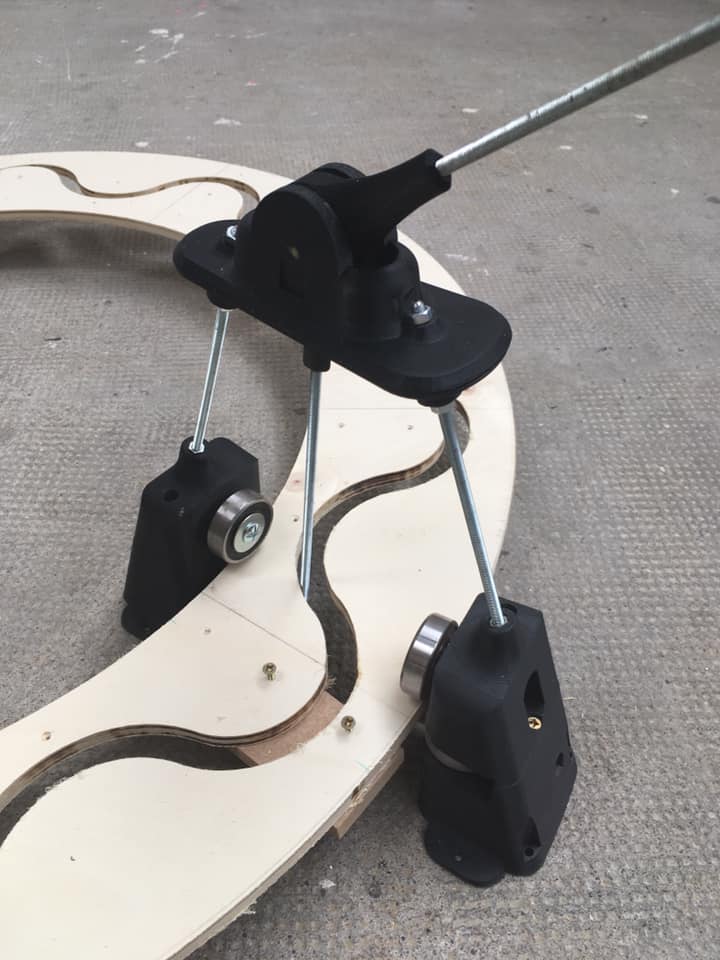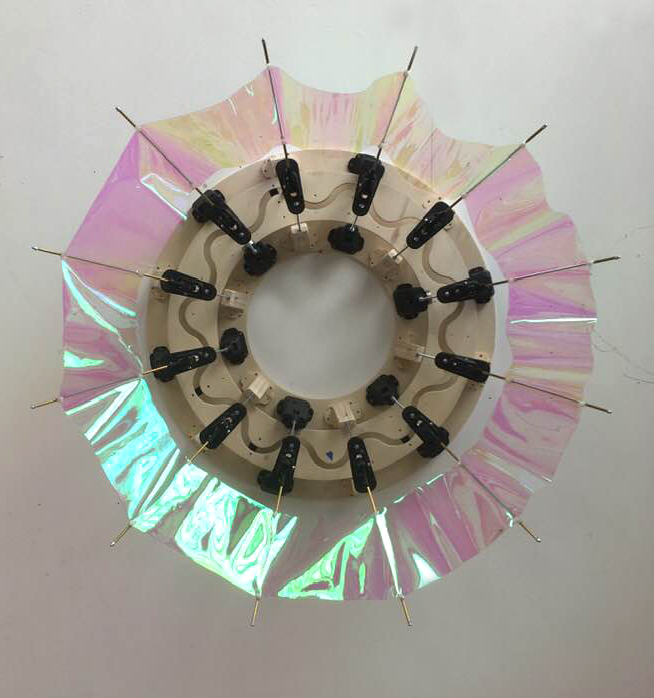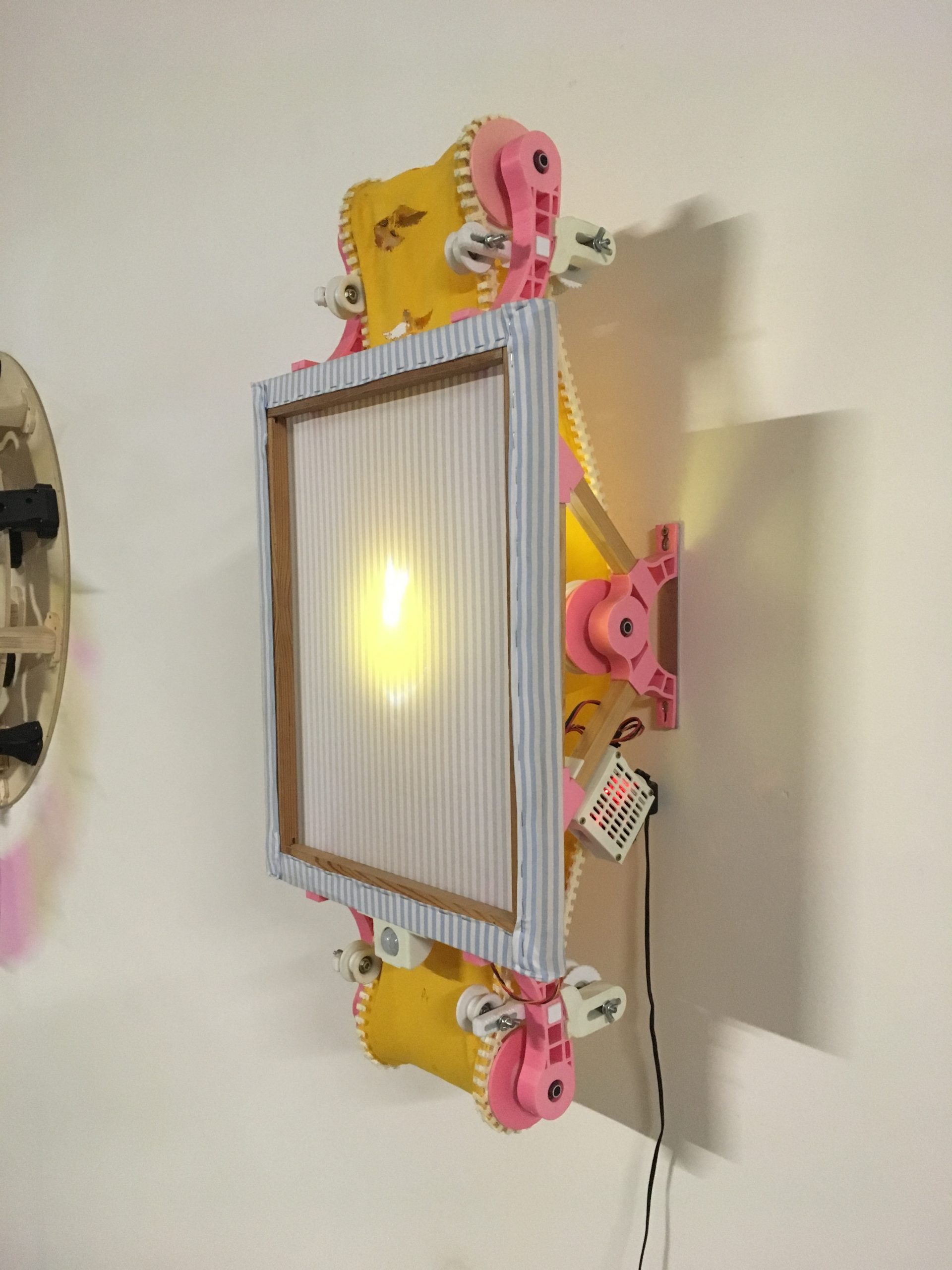 2019. 80 cm x 30 cm x 25 cm. Bois, impressions 3D, moteur, châssis et tissus.