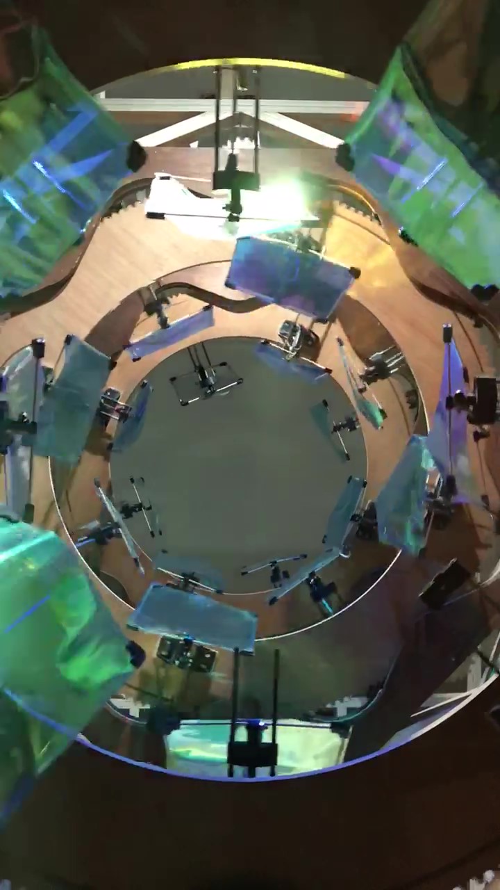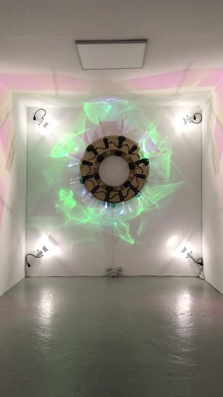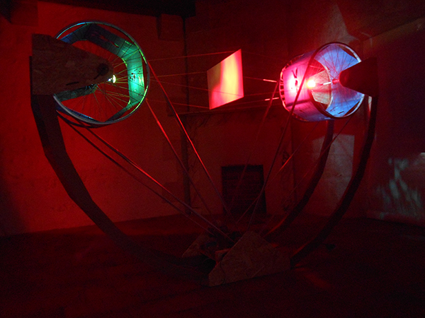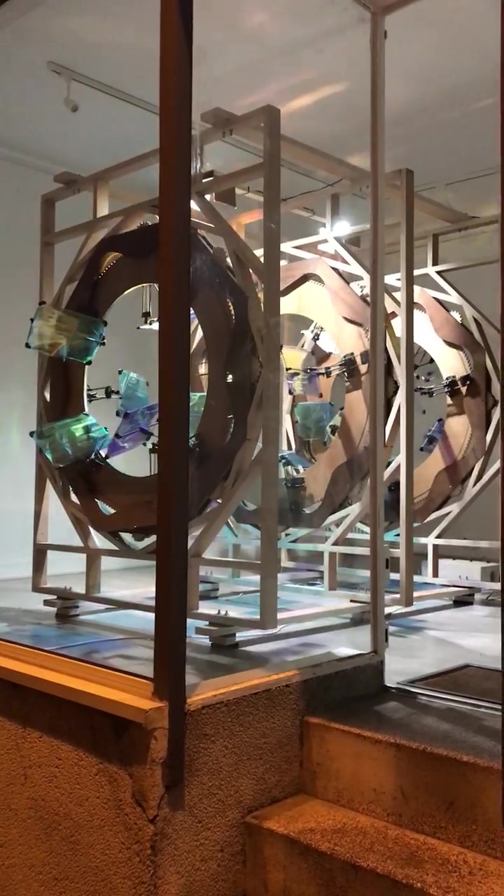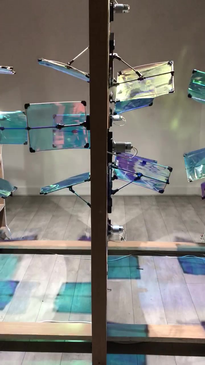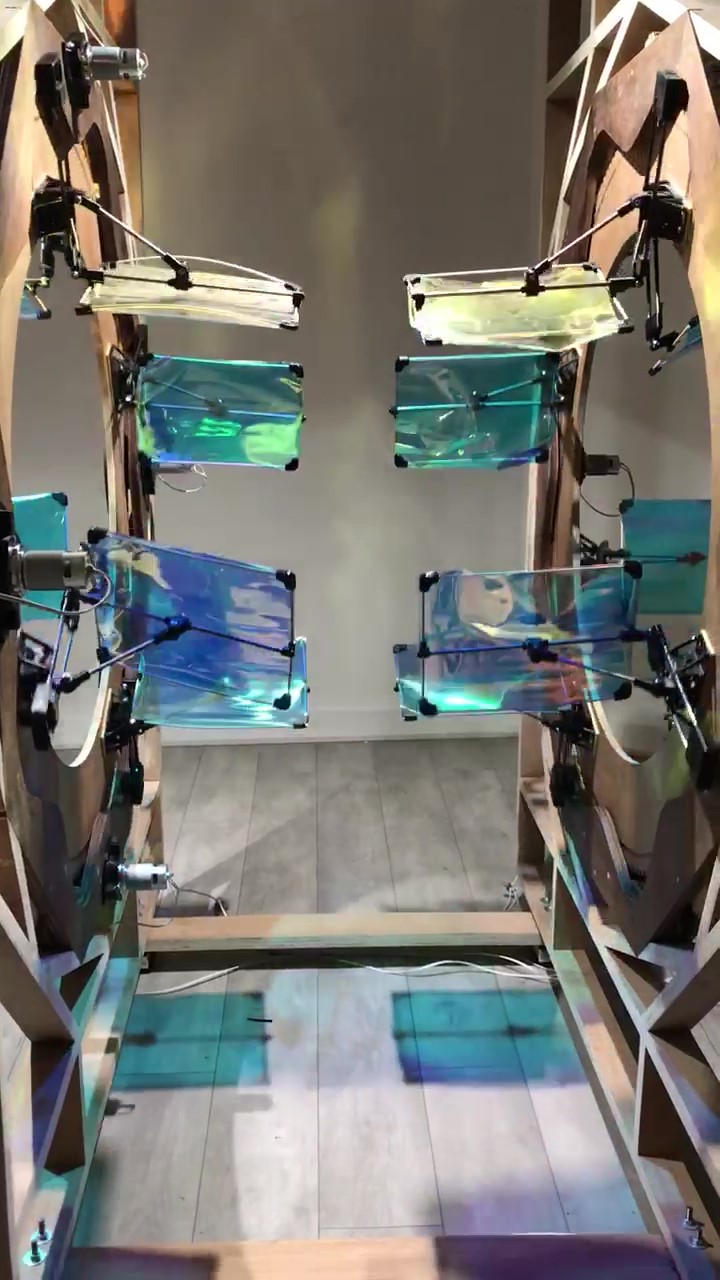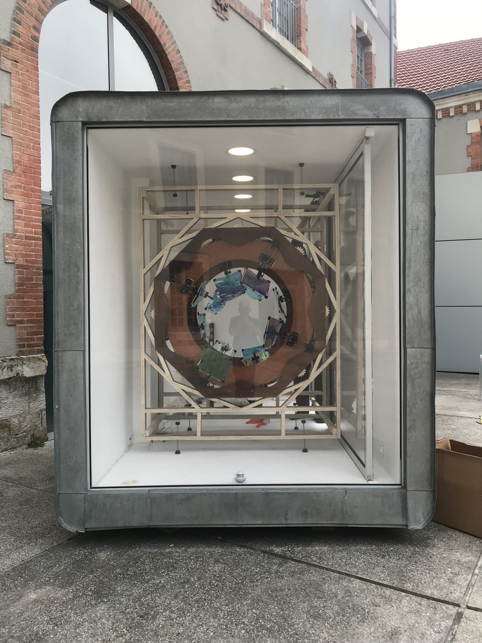 2021, bois, métal, moteurs, film dichroïque. 1,5 x 2 x 2,5 m.